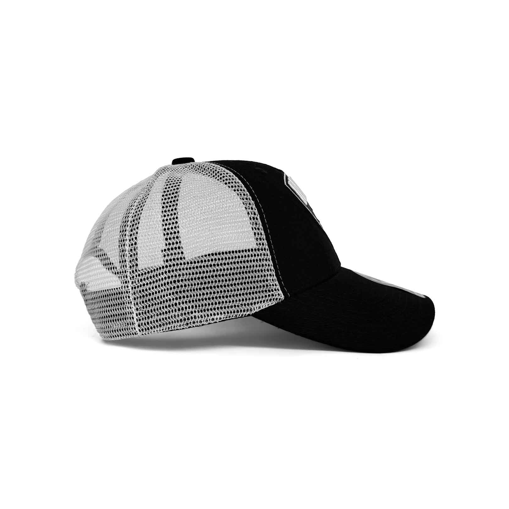 - Rounded crown with black structured front panels and mesh rear panels
