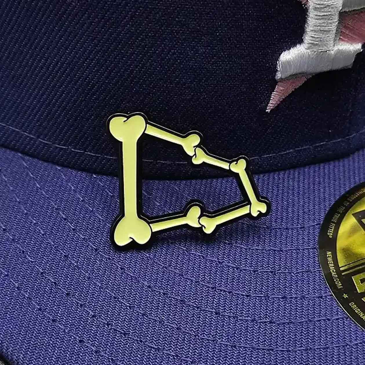 The Bone Outline Pin puts a fun twist on the classic cap shape, using a bold bone-themed design that stands out with its quirky, skeletal style.