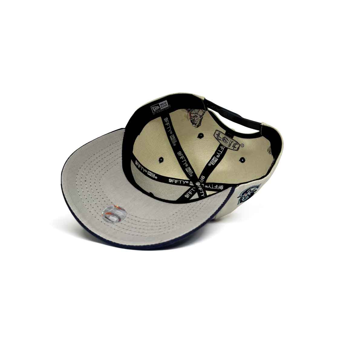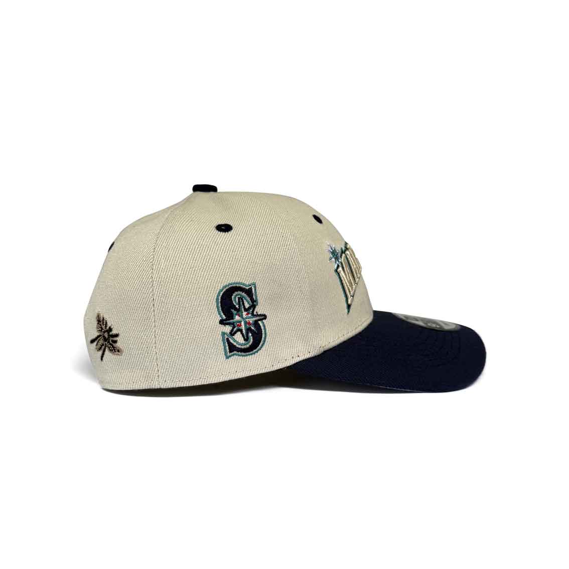The FELT X Seattle Mariners Low Profile 9FIFTY Snapback features an embroidered Mariners wordmark at the front panels, a team logo at the right-wear side, and a navy visor. Additional details include a gray under visor with a butterfly, bee, and FELT logo above a snapback closure at the rear.