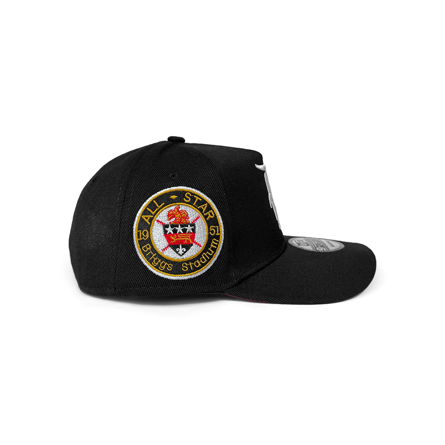 The New Era 9FORTY A-Frame Detroit Tigers Briggs Stadium Black/Scarlet Red Edition honors the Tigers’ historic home with a bold twist. Featuring a classic black crown, scarlet red visor, and a commemorative Briggs Stadium side patch, this piece blends vintage legacy with modern streetwear vibes. Complete with an adjustable snapback for all-day comfort and fit.