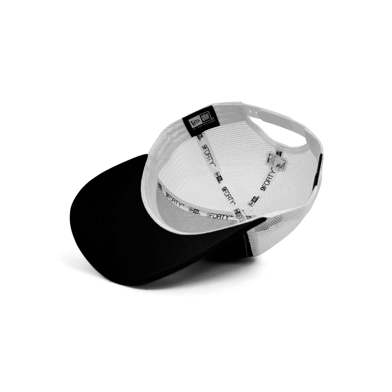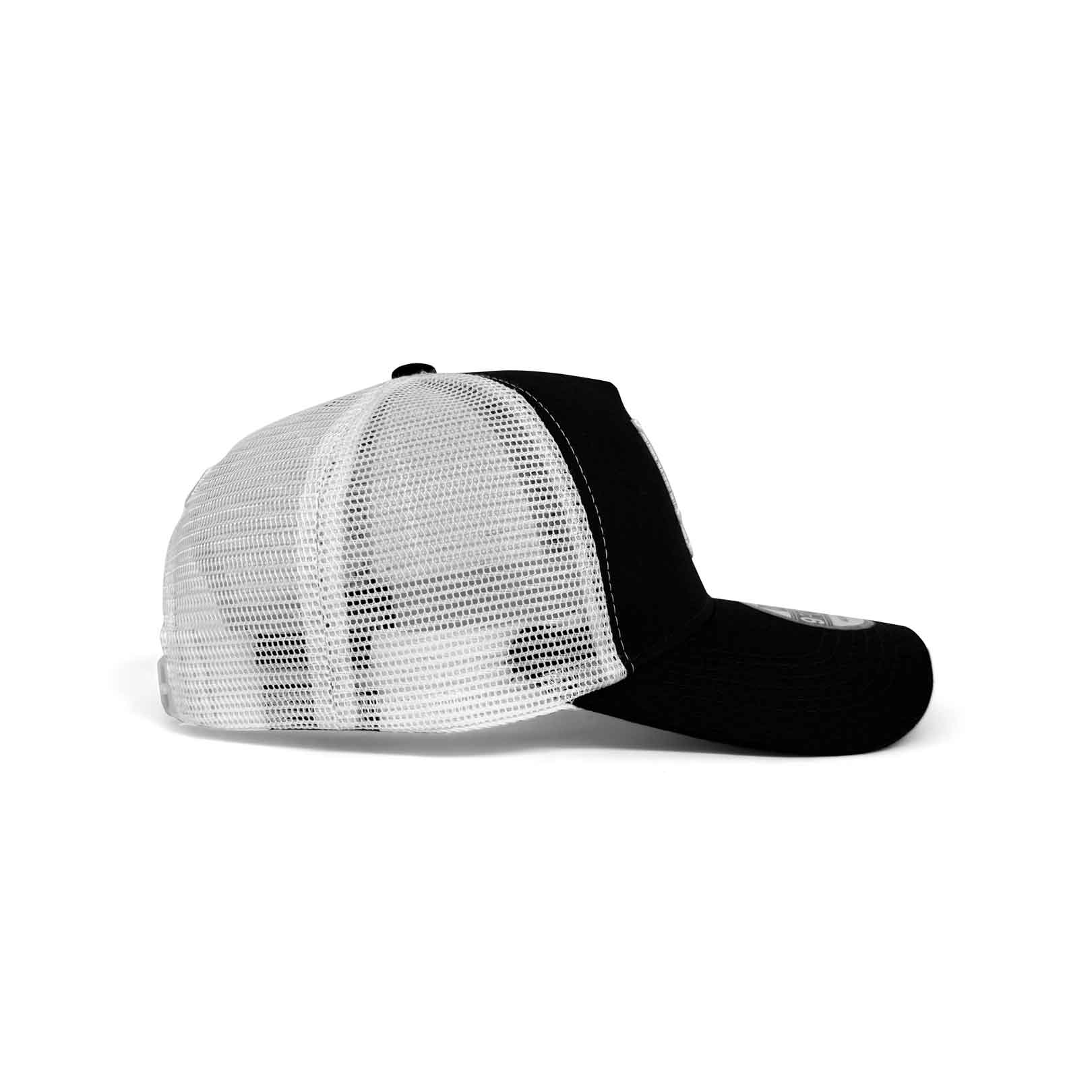 - Rounded crown with Black structured front panels and white mesh rear panels