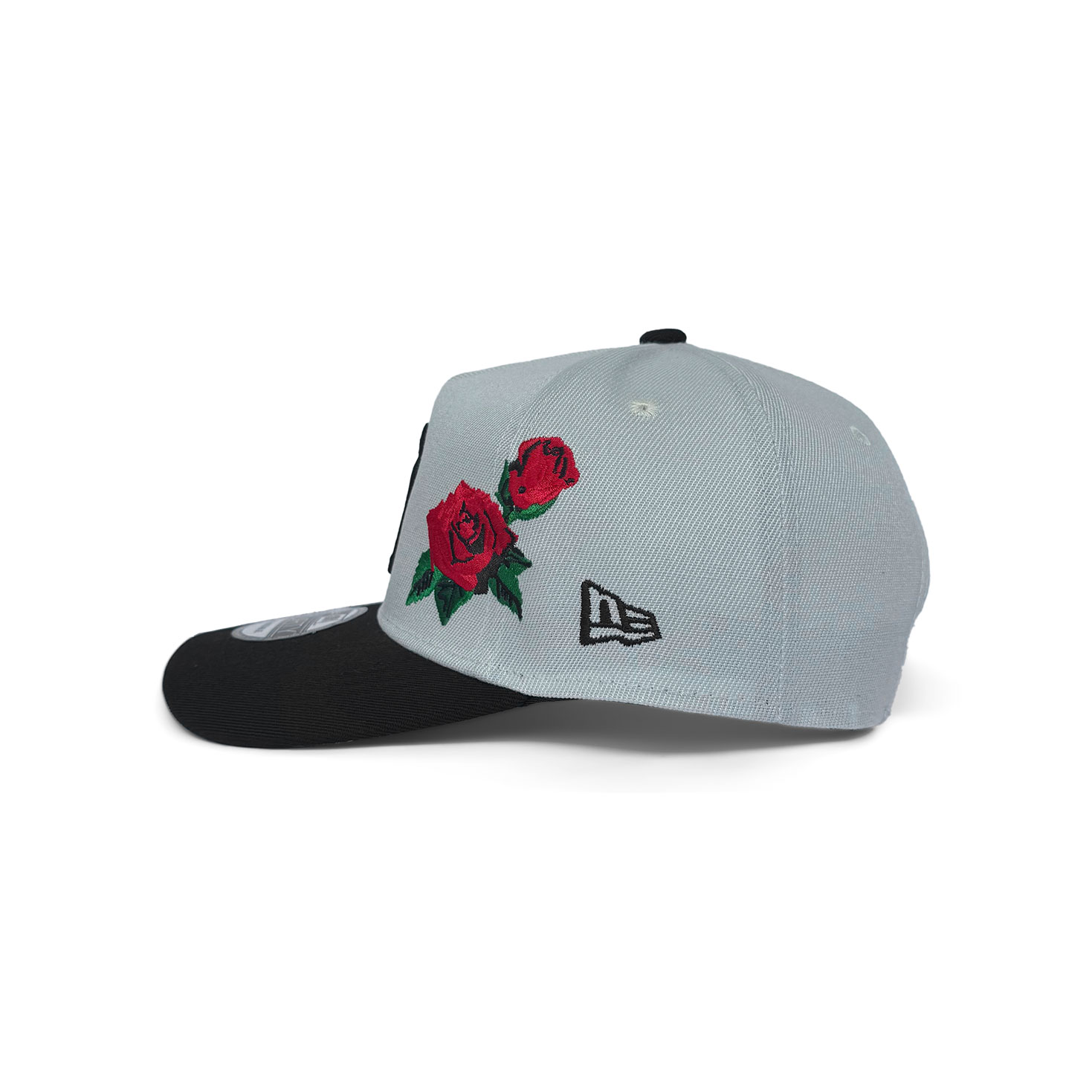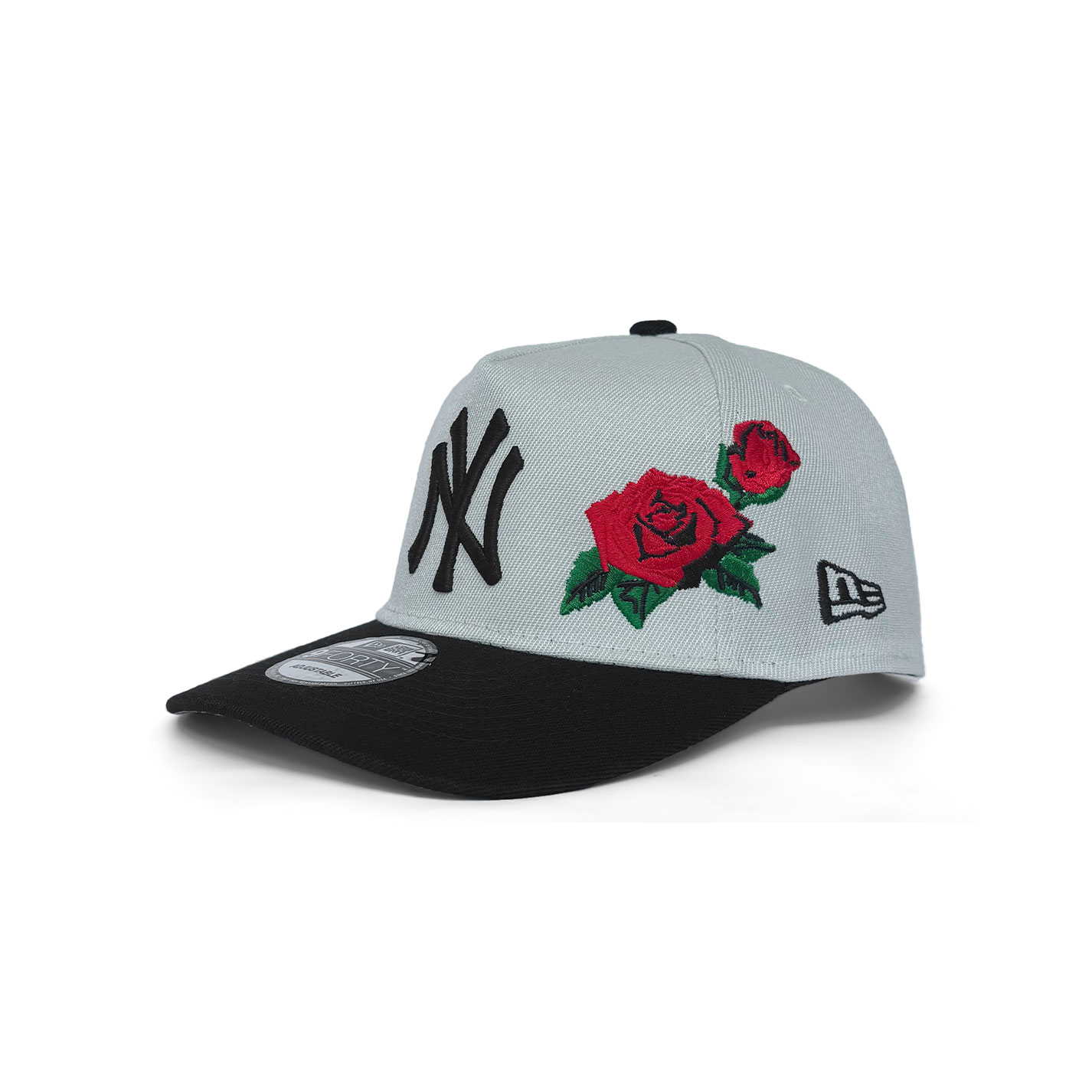A striking blend of sport and style. This 9FORTY A-Frame features the classic NY logo in bold black on a chrome white crown, paired with a black visor for contrast. Detailed red rose embroidery on the side adds a unique, fashion-forward twist. Finished with a curved visor and adjustable snapback for the perfect fit.