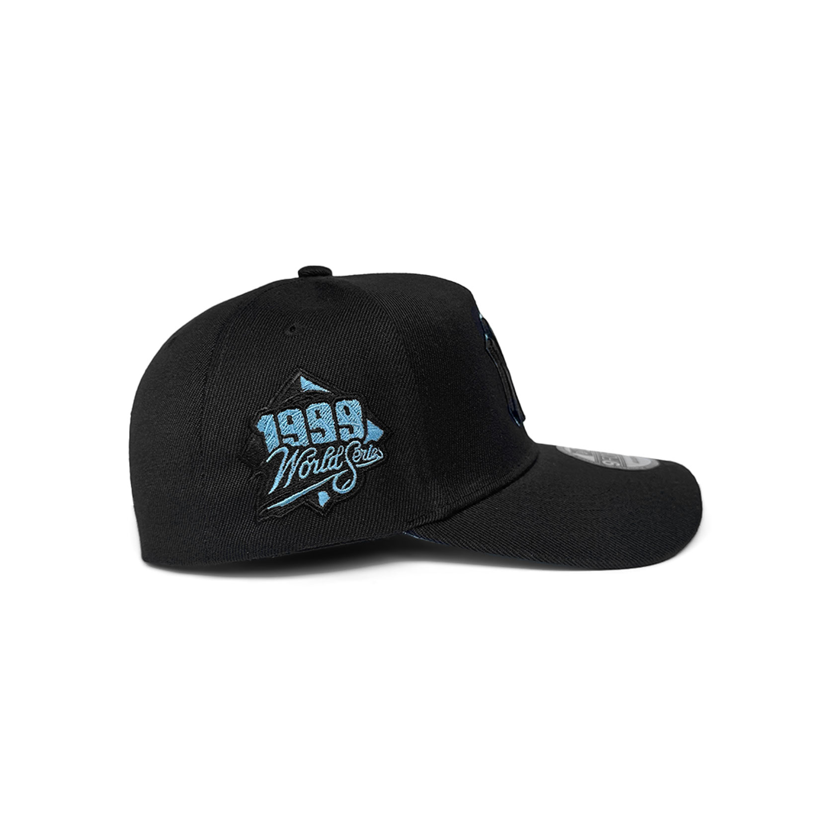 New Era 9FORTY A-Frame New York Yankees World Series 1999 Black Sky Edition features a sleek black base with cool sky-blue details and a commemorative 1999 World Series side patch for a standout look.