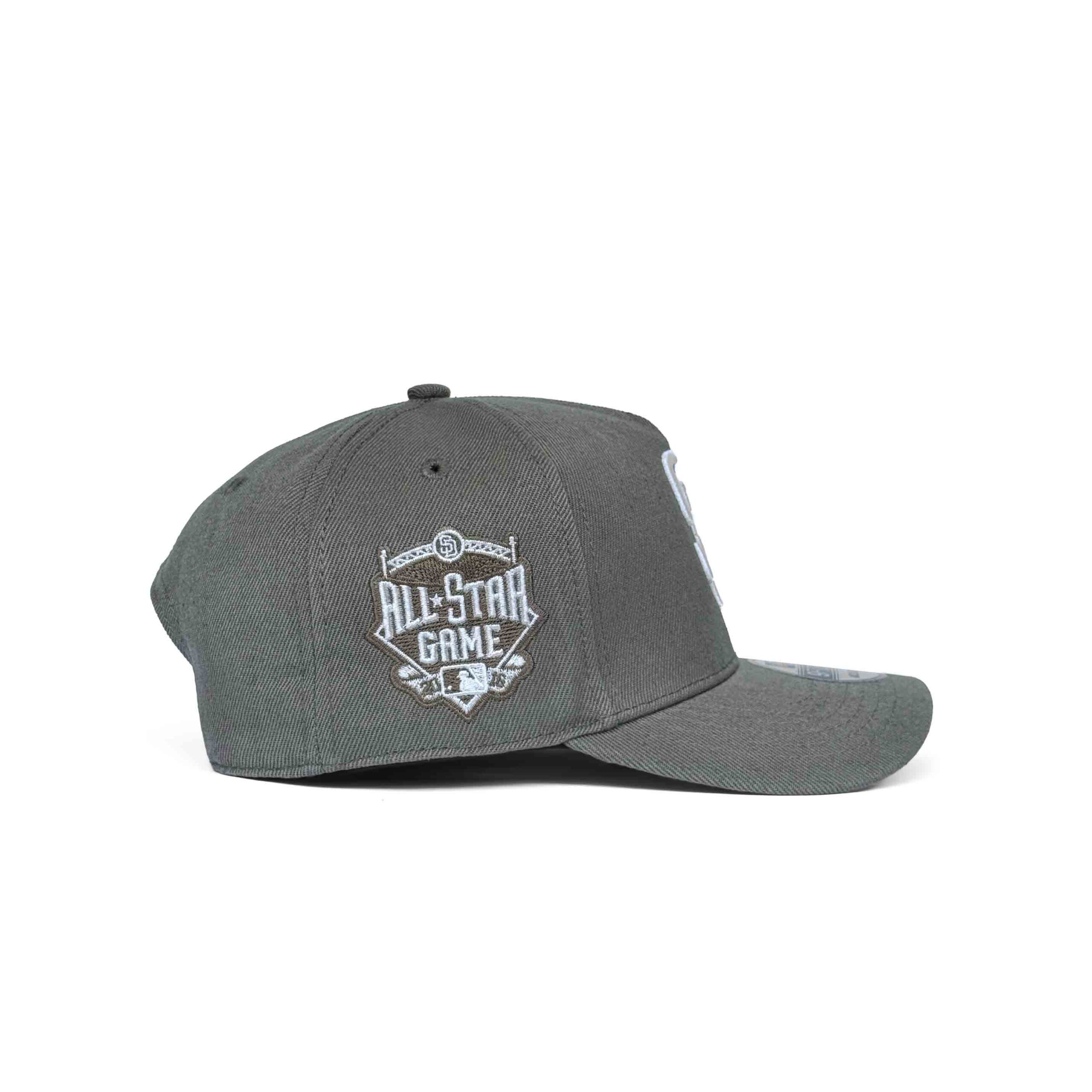 Rugged olive crown featuring the iconic SD logo and a commemorative 2016 All-Star Game side patch. Crafted with a structured A-Frame front and a classic curved visor for a premium, heritage-inspired silhouette. Finished with an adjustable snapback closure, delivering a secure and custom fit for Padres fans and collectors.